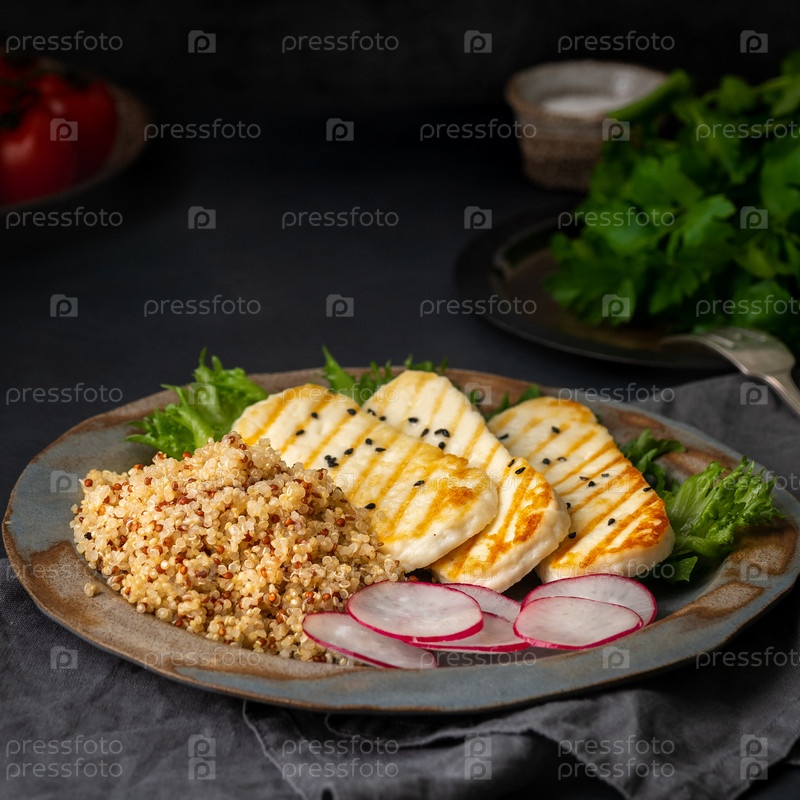 Халлуми, сыр на гриле с киноа, салат, редис. Сбалансированная диета на темном фоне, вид сбоку