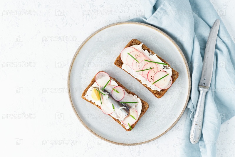 Пикантный смерреброд — два традиционных датских сэндвича. Черный ржаной хлеб с анчоусами, редисом, яйцами, сливочным сыром на серой тарелке на белом каменном столе, место для копирования