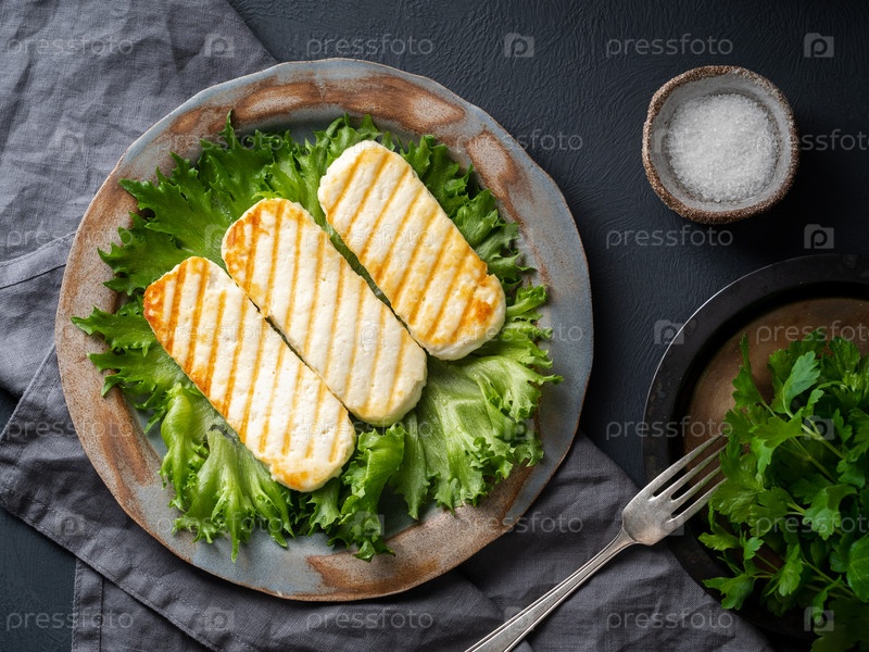 Жареный Халлуми, жареный сыр с салатом. Сбалансированная диета на темном фоне, вид сверху