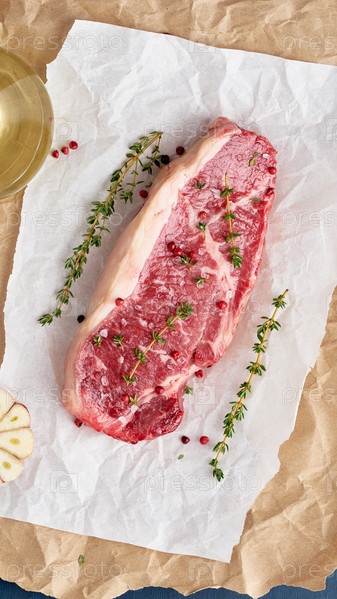 Большой кусок сырой говядины, стриплойн на белой пергаментной бумаге