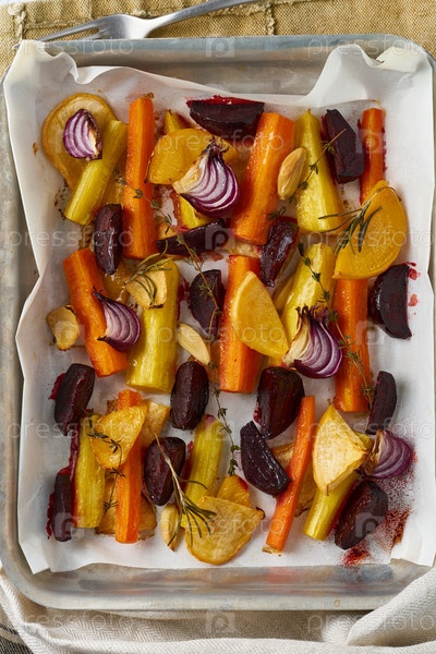 Красочные жареные овощи на подносе с пергаментом. Смесь моркови, свеклы, репы