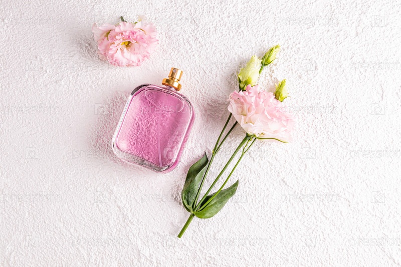 Стеклянный флакон розовых духов на белом фоне с цветами. Концепция натуральных цветочных ароматов. вид сверху. Копировальное пространство