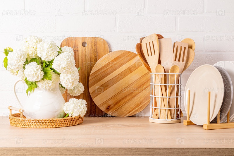 Красивый кухонный фон с разнообразной кухонной утварью и кувшином с цветущими ветвями. натюрморт. Передний план