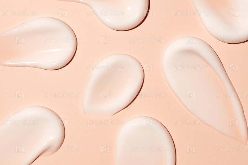 Образец белого косметического крем-лосьона размазывается по персиковому цветному фону