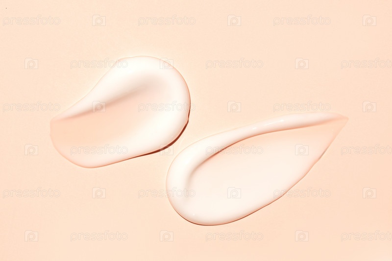 Косметический продукт, мазок белого увлажняющего лосьона, выделенный на бежевом, выжатая и размазанная часть тестирования крема для ухода за кожей