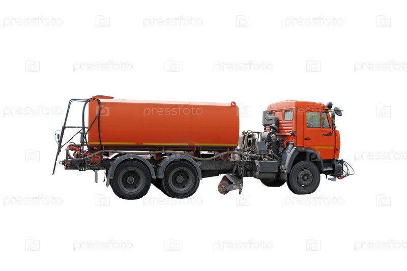 Оранжевая машина для уборки и полива улиц изолирована на белом фоне