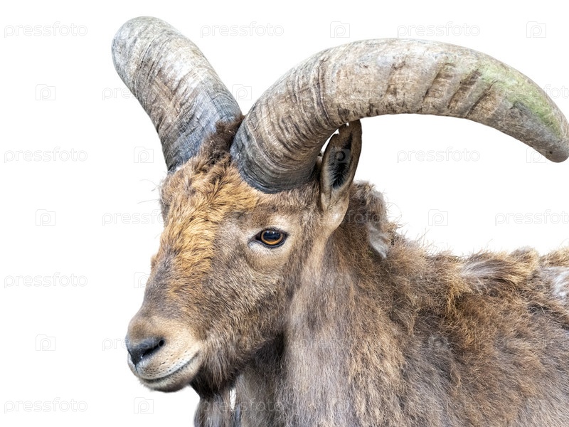 Молодой самец альпийского козерога на вершине горы изолирован на белом фоне