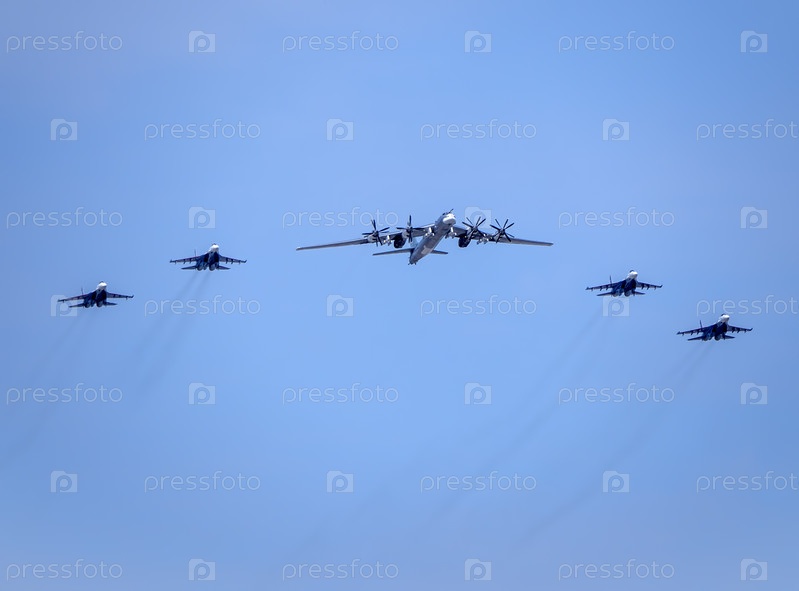 МОСКВА, РОССИЯ - 7 мая 2022 года: Авиапарад в Москве. Су-35 и стратегический бомбардировщик и ракетная платформа Ту-95 в небе на параде Победы во Второй мировой войне в Москве, Россия