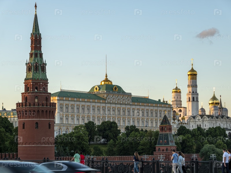 МОСКВА, РОССИЯ - 22 мая 2022 года: Вид на Московский Кремль со стороны Москвы-реки. Башни из красного кирпича и колокольня Ивана Великого