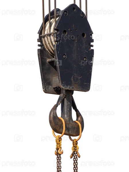 Стальной крюк крана с кабелем, изолированным на белом