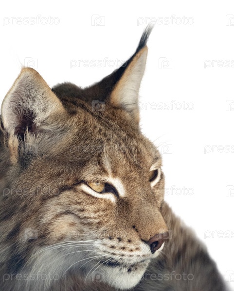 Евразийская рысь спереди изолирована на белом фоне