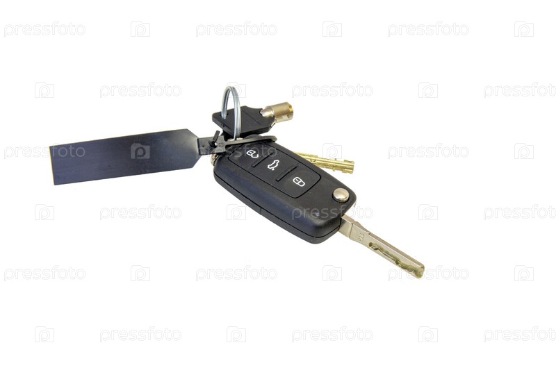 Черный ключ от машины и брелок на белом фоне