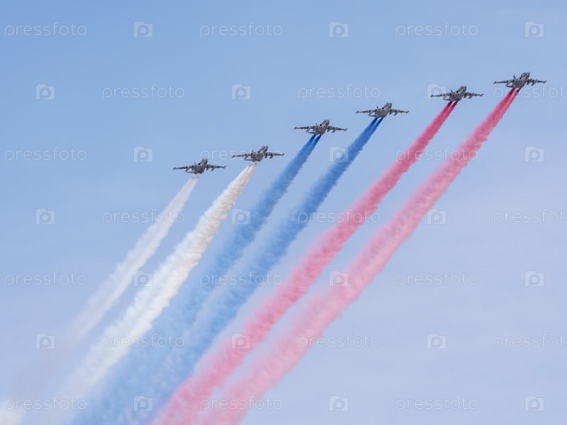 МОСКВА, РОССИЯ - 7 мая 2021 года: Авиапарад в Москве. Группа российских истребителей Су-25 с нарисованным российским флагом в небе на параде Победы во Второй мировой войне в Москве, Россия