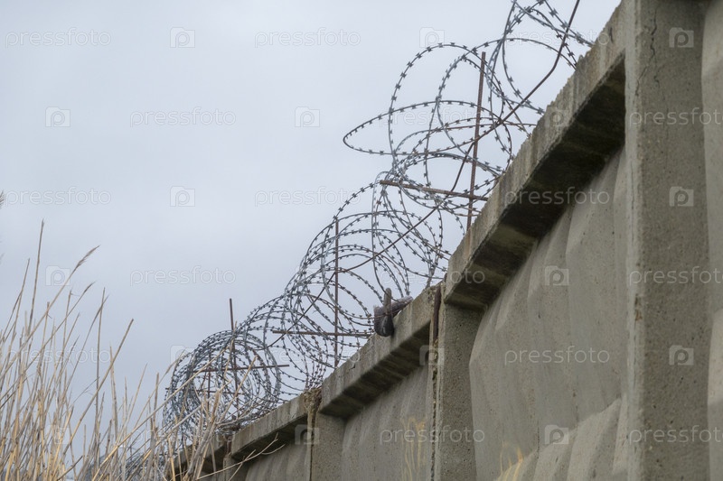 Колючая проволока над бетонной стеной на фоне облачного неба