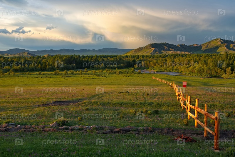 Россия. Юг Западной Сибири, горный Алтай. Деревянный забор уходящий в даль в горных степях вдоль дороги по Уймонской долине