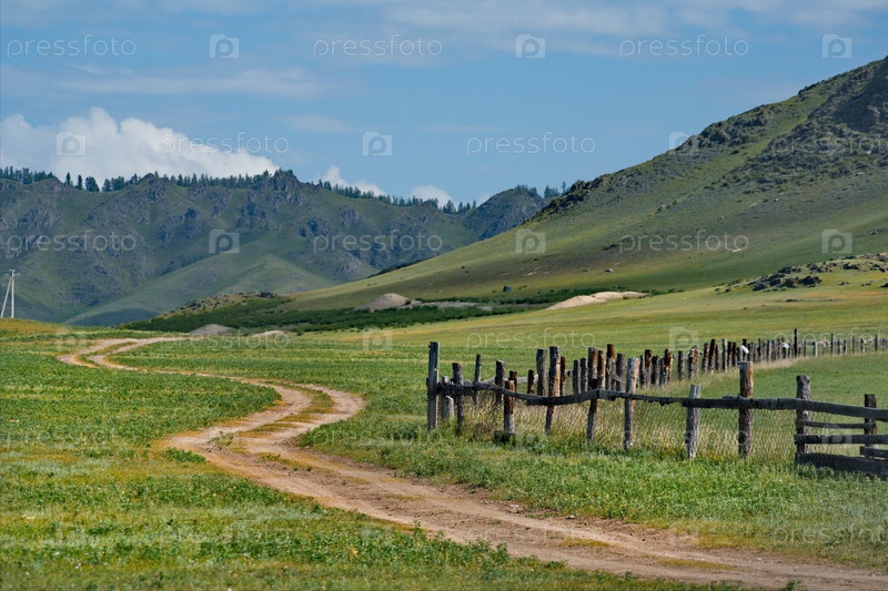 Россия. Юг Западной Сибири, горный Алтай. Деревянный забор уходящий в даль в горных степях вдоль дороги по Уймонской долине