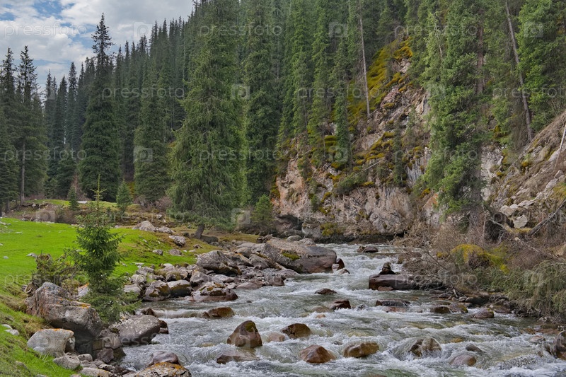 Кыргызстан, восточный берег озера Иссык-Куль. Вид на каменистую реку Арашан среди замшелых скал заросшего ущелья