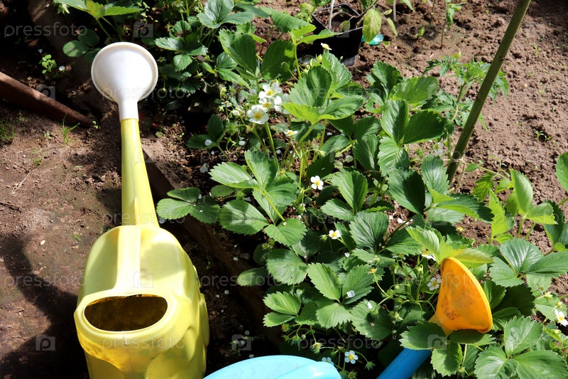 Цветущие кусты клубники и лейка в теплице, вид сверху