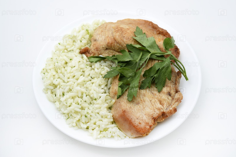 Сочное жареное куриное филе с рисом на тарелке. Вкусный завтрак с мясом и рисом