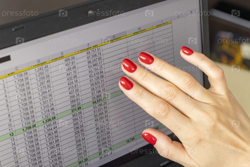 Крупный план женщины с красивыми руками и маникюром, работающей на ноутбуке, прокручивающей сенсорный экран с открытой таблицей погашения ипотечного кредита. Финансы