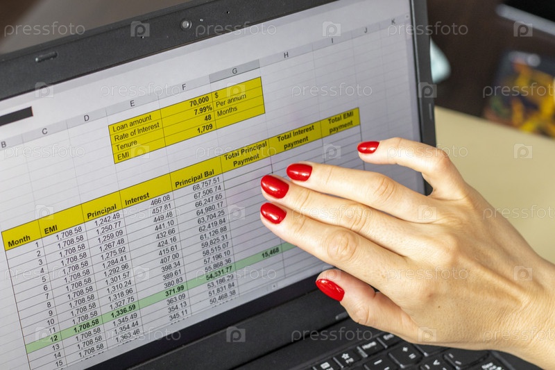 Крупный план женщины с красивыми руками и маникюром, работающей на ноутбуке, прокручивающей сенсорный экран с открытой таблицей погашения ипотечного кредита. Финансы