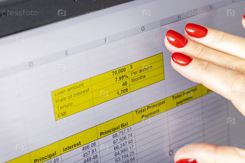 Крупный план женщины с красивыми руками и маникюром, работающей на ноутбуке, прокручивающей сенсорный экран с открытой таблицей погашения ипотечного кредита. Финансы