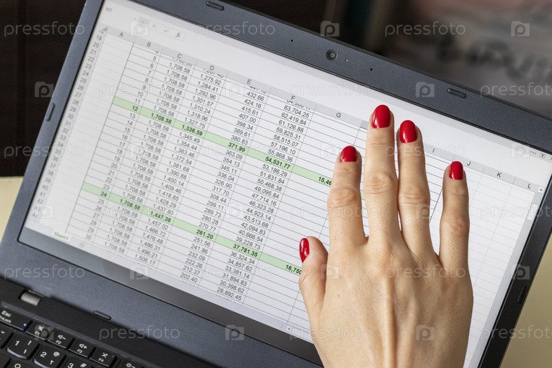 Крупный план женщины с красивыми руками и маникюром, работающей на ноутбуке, прокручивающей сенсорный экран с открытой таблицей погашения ипотечного кредита. Банковское дело