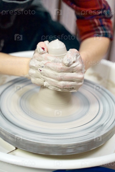 Женщина делает керамическую керамику, четыре руки крупным планом, фокусируются на гончарах, ладони с керамикой