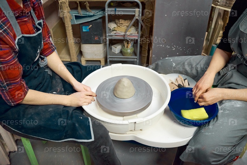 Женщина делает керамическую керамику, четыре руки крупным планом, фокусируются на гончарах, ладонях с керамикой, концепции мастер-класса и мастер-класса. Концепция творческого хобби. Дополнительный заработок, подработка