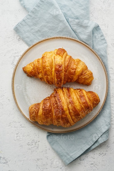 Два вкусных круассана на тарелке и горячий напиток в кружке. Утренний французский завтрак