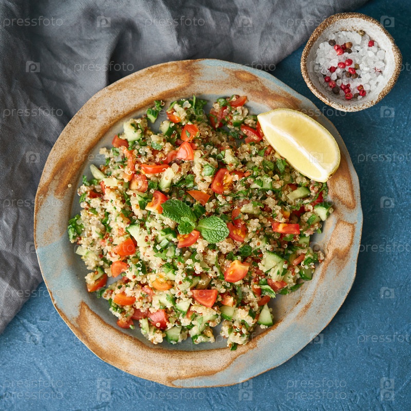 Салат Табуле с киноа. Восточная еда с овощной смесью на темном столе, веганская диета. Вид сверху