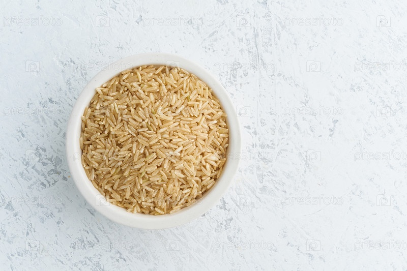 Коричневый рис в белой миске на белом фоне Сушеные крупы в чашке, веганская еда, диета fodmap Вид сверху, крупный план