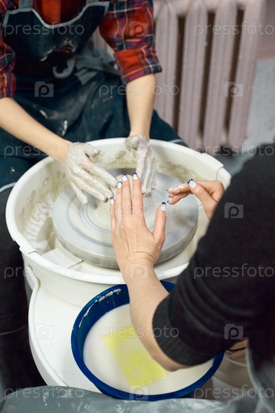 Женщины делают керамическую керамику, концепция мастер-класса и мастер-класса, крупный план в четыре руки, внимание к гончарам, ладони с керамикой. Две женщины. Концепция творческого хобби. Заработок дополнительных денег, вертикальный