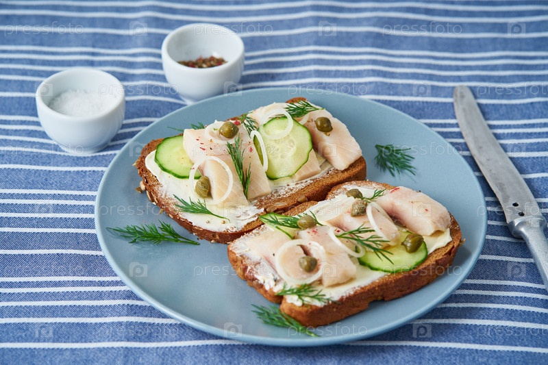 Сморреброд с селедкой – традиционные датские бутерброды. Черный ржаной хлеб с сельдью на темно-синем фоне, вид сбоку