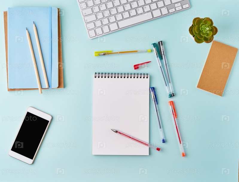 Вид сверху современного синего офисного рабочего стола с пустым блокнотом, компьютером, смартфоном