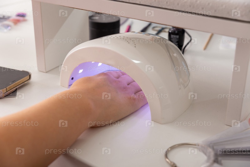 Процесс маникюра с гель-лаком в УФ-лампе. Салонная процедура. Мастер покрывает ногти клиентки шеллаком