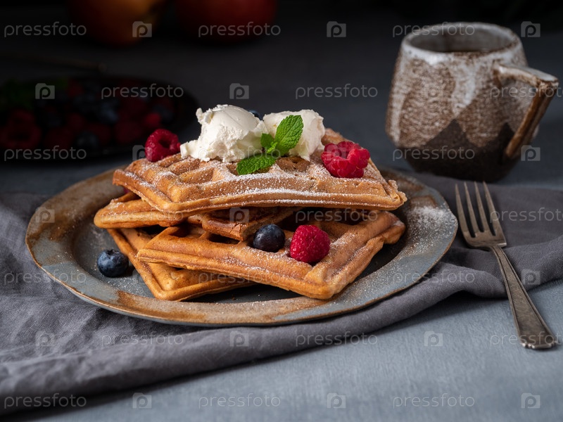 Бельгийские вафли с малиной, шоколадным сиропом. Завтрак с чаем на темном фоне, вид сбоку