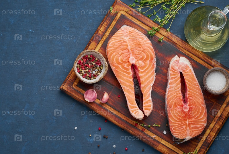 Два стейка лосося, рыбное филе, большие нарезанные порции на разделочной доске на темном столе. Вид сверху, пространство для копирования