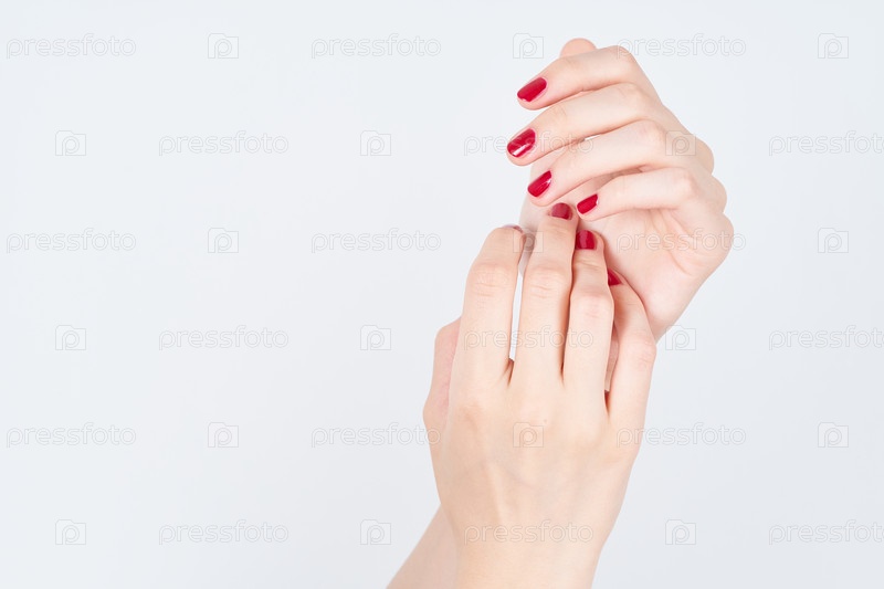 Молодые женские руки с красивым красным лаком для ногтей с глянцевым блеском, уход за кожей рук, спа-терапия для женщин, копировальное пространство на белом фоне