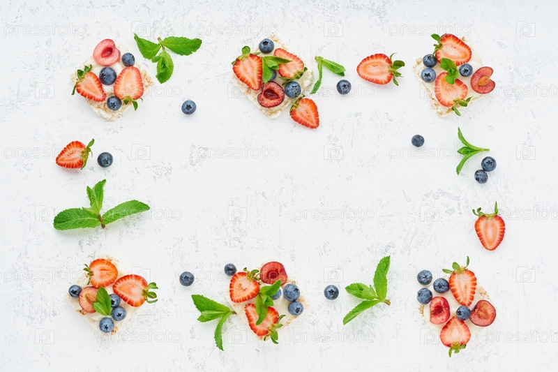 Вегетарианская диета хрустящая рамка с ягодами: клубника, черника, черника, ежевика и банан на пастельном фоне, вид сверху