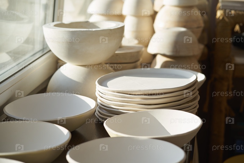 Производство керамических изделий, заготовок. Красивый фон с керамической посудой у окна