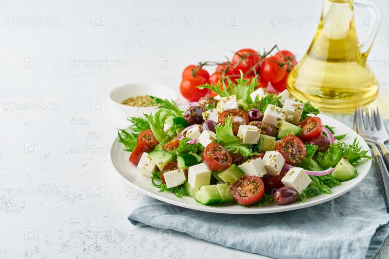 Греческий салат с сыром фета, оливками, помидорами черри, огурцами, салатом и луком, вегетарианская средиземноморская кухня, низкокалорийная диетическая еда