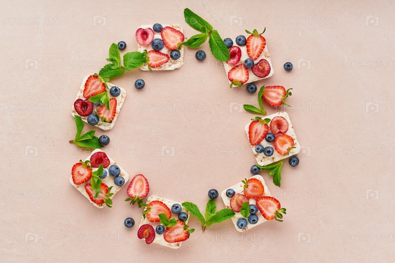 Вегетарианская диета хрустящая рамка с ягодами: клубника, черника, черника, ежевика и банан на пастельном терракотовом фоне, вид сверху