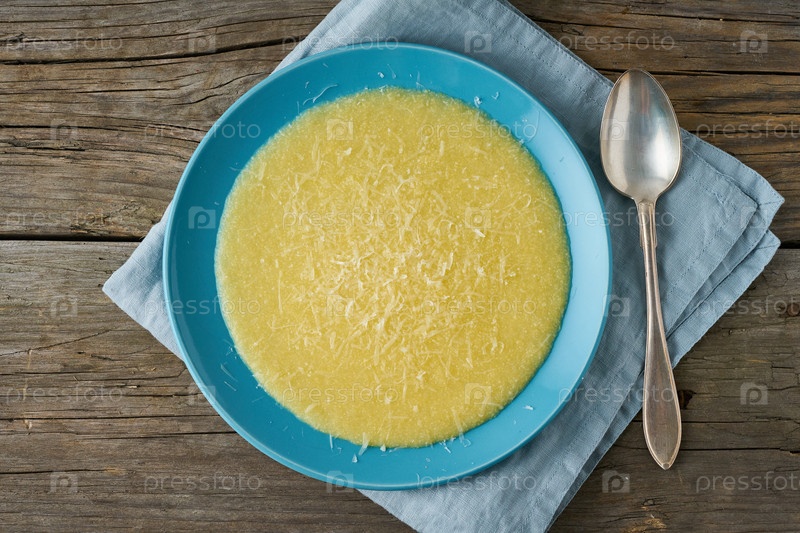 Полента, каша с сыром пармезан на старом темном деревянном фоне, вид сверху, традиционная итальянская кухня