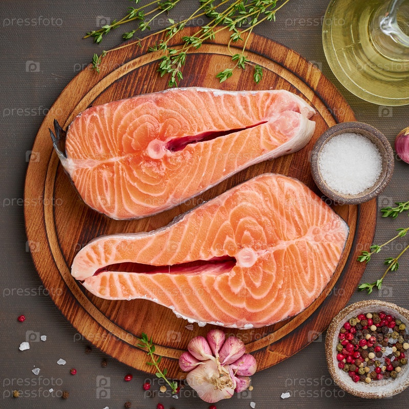 Два стейка из лосося, вид сверху, крупный план. Рыбное филе, большие нарезанные порции на разделочной доске на темном столе