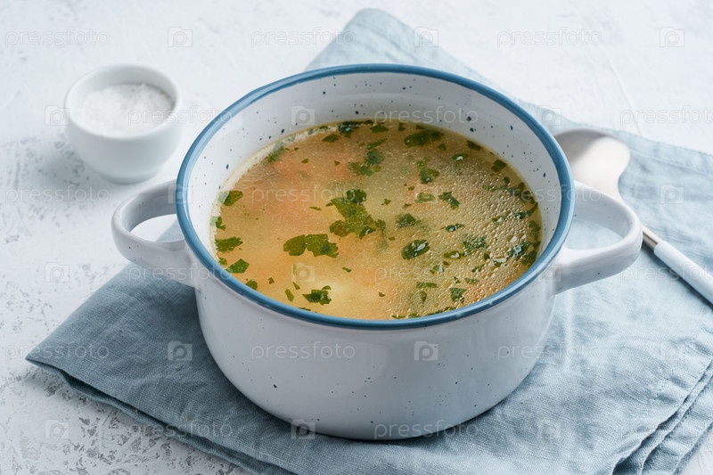 Куриный суп, скандинавская домашняя еда на синем каменном столе, вид сбоку