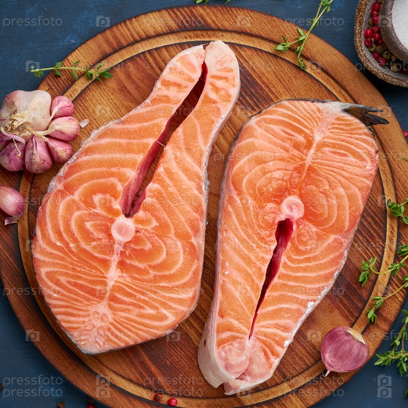 Два стейка лосося, рыбное филе, большие нарезанные порции на разделочной доске на темном столе. Вид сверху, крупный план