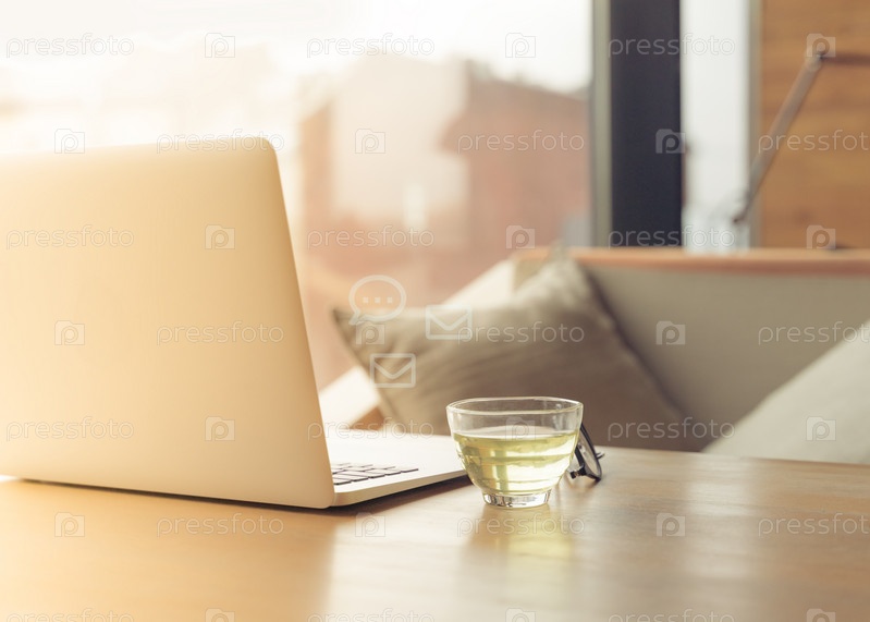 Внештатный стол с открытым ноутбуком, чашкой зеленого чая и стаканами на столе. Кафе или коворкинг. Концепция цифровых кочевников, домашнего офиса, ведения блога. Нет людей