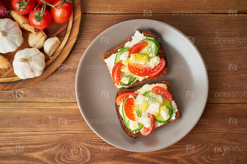 Сморреброд – традиционные датские бутерброды. Черный ржаной хлеб с вареным яйцом, сливочным сыром, огурцом, помидорами на темно-коричневом деревянном фоне, вид сверху