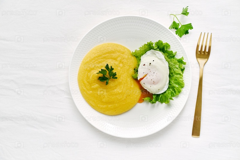Яйцо бенедикта с полентой и салатом на белой тарелке, место для копирования, здоровая веганская еда